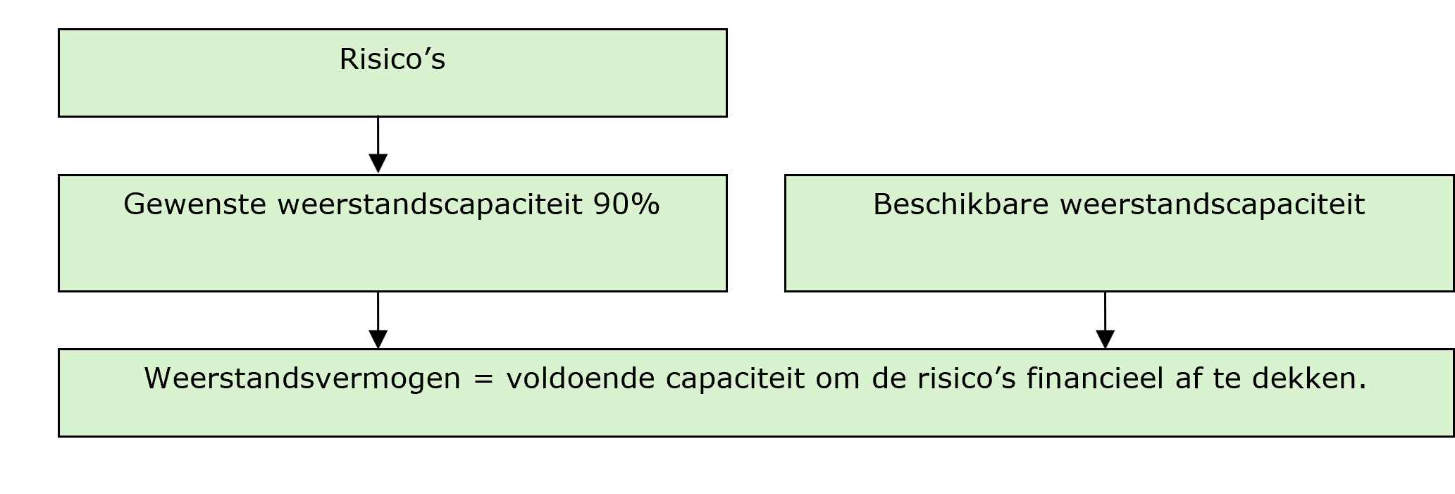 Bij het bepalen van een norm (ratio weerstandsvermogen) is het belangrijk dat we zoeken naar een evenwicht tussen financiële soliditeit enerzijds en het streven om niet onnodig geld “op de plank” te laten liggen anderzijds. Een belangrijk criterium hierbij is de kwalitatieve beoordeling van de risico’s. Als deze hoger uitvallen, kunnen we volstaan met een lagere financiële weerstandscapaciteit en dus met een lager verhoudingsgetal.